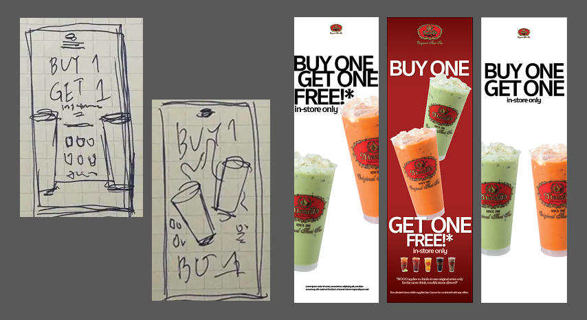 Sketches and ideation. The banner initially was supposed to be 3 x 10 feet but was later changed to 3 x 6 feet.